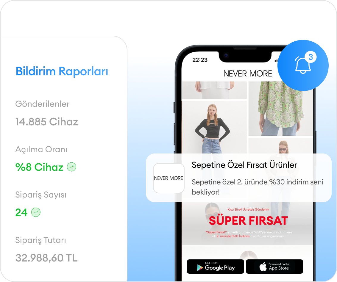 Mobil uygulamanız üzerinden müşterilerinize hızlı ve kolay bir şekilde bildirimler gönderebilirsiniz.