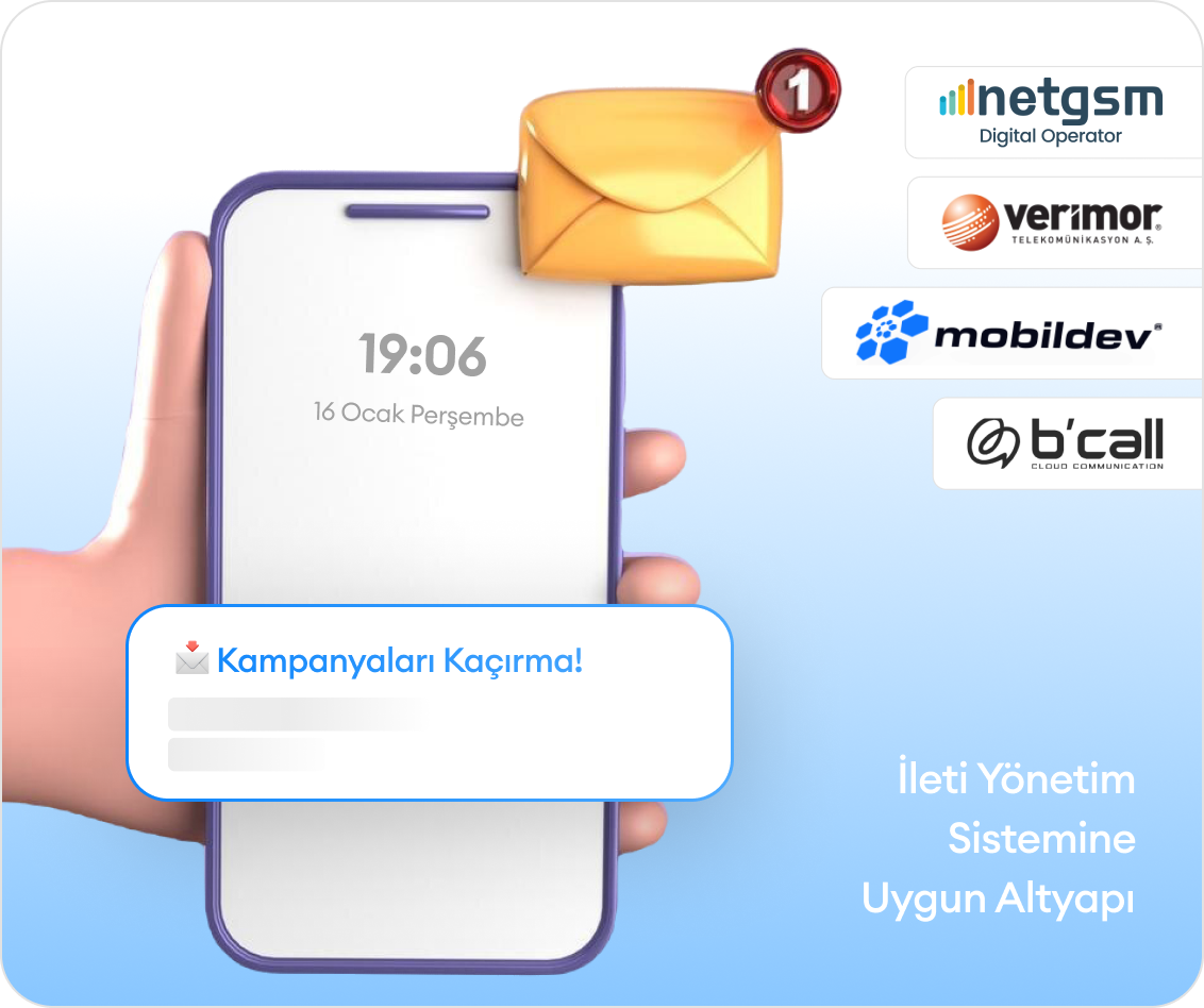 Mobildev ve Verimor İYS entegrasyonları ile uyumlu çalışır, böylece yasal süreçlere uygun şekilde ticari ileti gönderimi yapabilirsiniz.